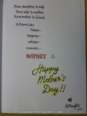 ... there is much beauty in simple things in life and i think por por is very touched by our simple but special get together. You and your bros have been very appreciative and encouraging to your dad and i and the countless beautiful handmade cards on our birthdays and anniversaries stand as testimony to that. THANK YOU for "the beautiful one of a kind and no money can buy" mother's day card - so so cute - one more added to our collection le... haha